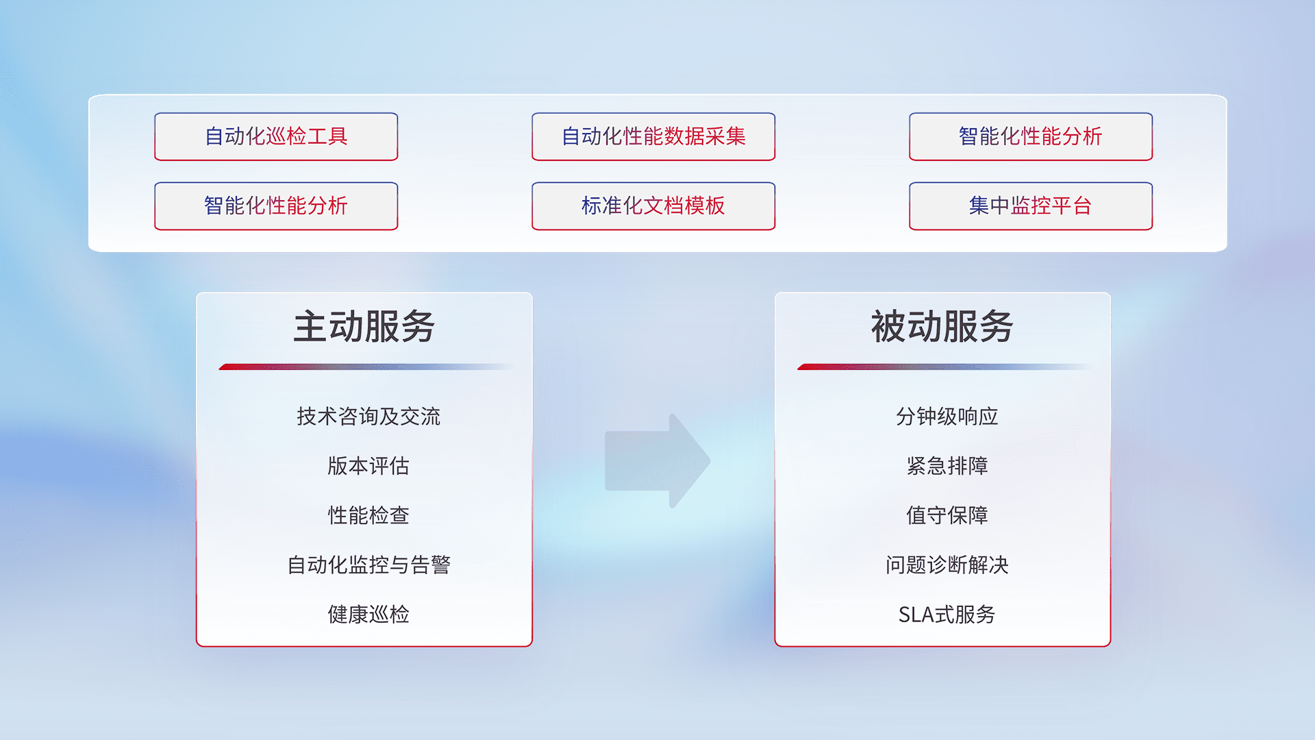 智能化工具和标准化文档,,,,保障服务质量,,,,提供主动服务(包含技术咨询、、版本评估、、、性能检查、、、、自动化监控与告警、、、健康巡检)和被动服务包含(分钟级响应、、、、紧急排障、、值守保障、、问题诊断解决、、、SLA服务)。。。。